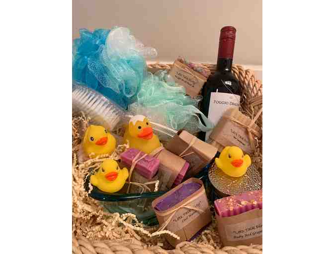 Enjoy a relaxing night in with the 'Let's Talk Dirty' handcrafted soap collection basket. This basket includes 7 different scented soaps, with scents like Lavender or Gardenia, 2 loofas, a bath scrubber, a bottle of delicious Merlot, a scented candle as well as some rubber duckies to keep you company as you soak. These wonderful artisian soaps were handcrafted by Kathy Holleran Schueller.