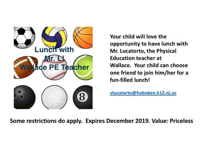 Your child will love the opportunity to have lunch with Mr. Lucatorto, the Physical Education teacher at Wallace. Your child can choose one friend to join him/her for a fun-filled lunch!