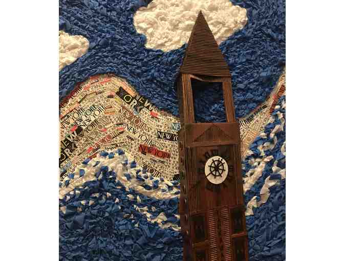 For this project I wanted to pay homage too Hoboken, a city that has welcomed my family with open arms. This piece is the ninth in a series that I began in 2012, each year since then I have added at least one piece to the series. All the pieces have a common theme of the words 'New York' flowing throughout. I like to use unusual and/or recycled materials in my work and try to repurpose them into something completely new.