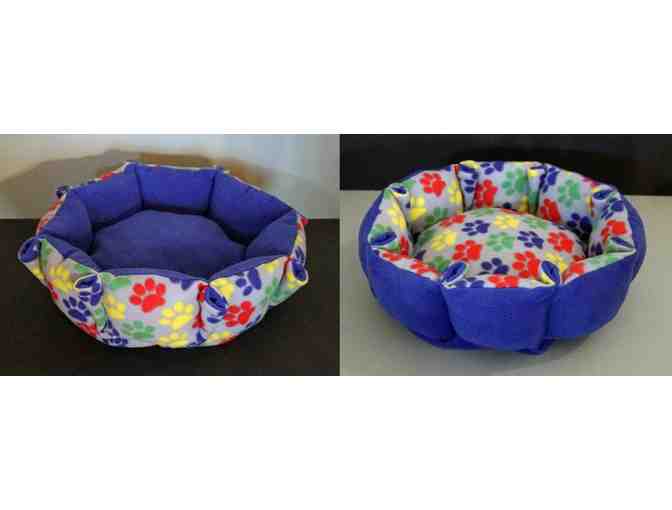 Up for auction is this reversible cat bed, measuring 17 inches in diameter. The picture makes it look a little purple but it is a deep blue.