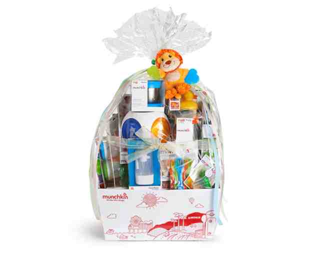Custom curated gift basket featuring 27 popular Munchkin products. Includes favorites like: Latch™ Bottle, Fun Ice® Hand Chewy Teether, Deluxe Snack Catcher, White Hot Ducky, and Deluxe Stay-in-Place™ Mirror