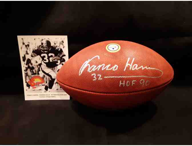 Authenic NFL football with Steeler's logo autographed by Franco Harris with notation of 1990 Hall of Fame induction.