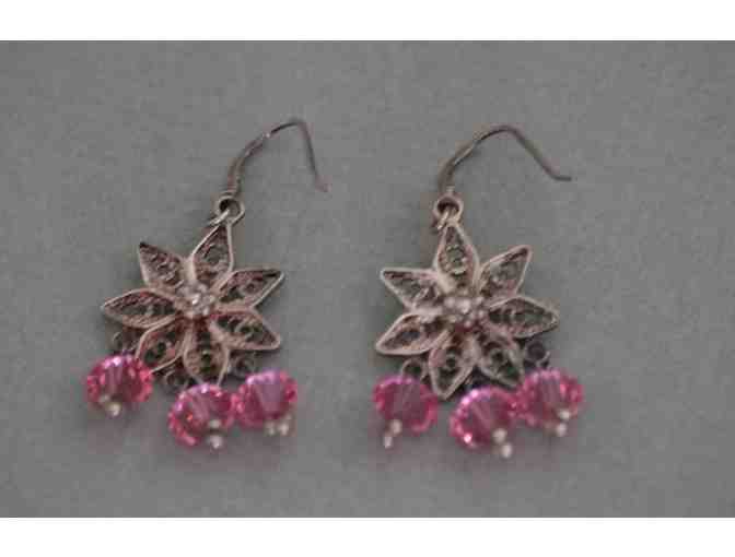 Up for auction is this pair of Sterling Silver Flower Earrings with Pink Crystals - handmade in Pennsylvania - measuring 1-3/4 inches long.