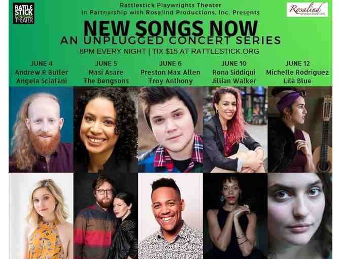 You are bidding on a voucher for Two (2) Tickets to New Songs Now, a Main Stage production of Rattlestick Playwrights Theater. Choose the BUY NOW option to enjoy tickets right away before auction ends June 10.