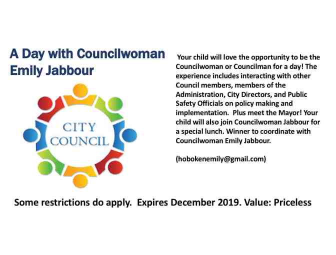 Your child will also join Councilwoman Jabbour for a special lunch. Winner to coordinate with Councilwoman Emily Jabbour (hobokenemily@gmail.com).
