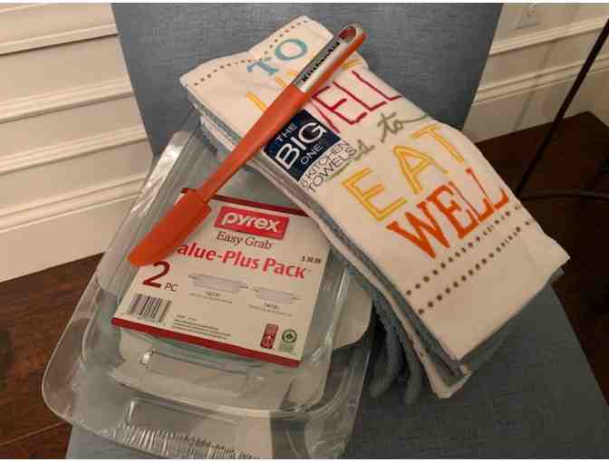 Includes: (2) piece Pyrex set: 9"x13"x2" 3qt baking dish and 11"x7in"x2" 2qt baking dish, kitchen aid rubber scraper and stack of 6 large kitchen towels.
