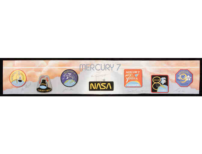 Mercury 7 Autographed Astronaut Signature Panel. Panel Autographed by John Glenn, Alan Shepard, Wally Schirra, Gordon Cooper, Deke Slayton, Scott Carpenter, and Betty Grissom (who signed by Gus). Measures 7" x 35"