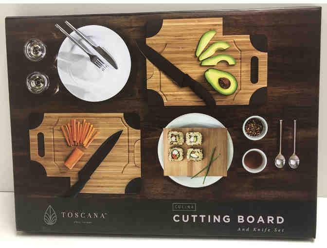 A bamboo cutting board featuring a convenient carry handle, carving knife with powder-coated steel blade and cushioned grip, a carved moar to prevent brine or juice run-off, removable silicone accents on the corners to grip the countertop or table, swivel stand for convenient storage, and over 132 square inches of cutting surface.