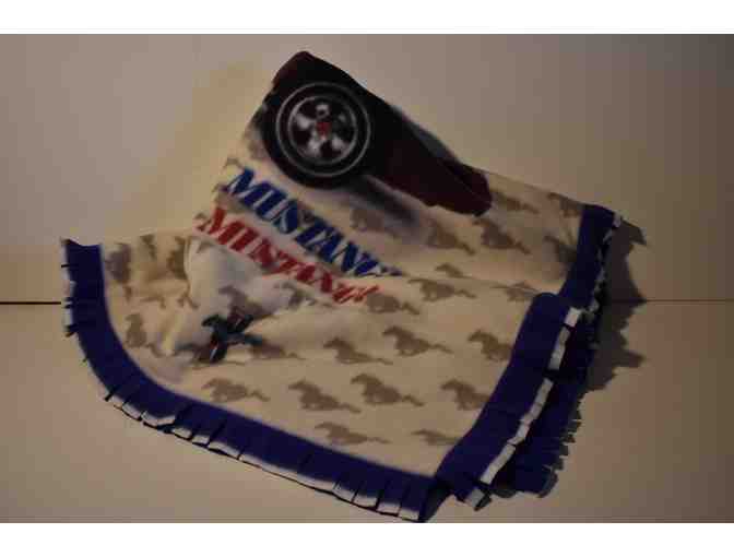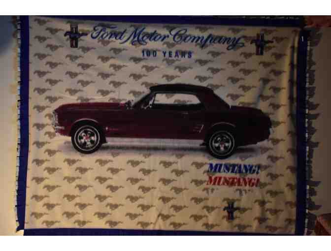48" x 62" Fleece Blanket Featuring 100 years of the Ford Motor Company with accompanying Mustang and Mustang Logos.