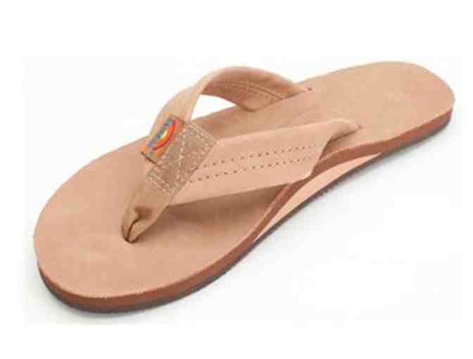 The women's Rainbow Sandals Premier leather single-layer flip-flops are made with top-grade nubuck leather and parachute box-stitched toe pieces. They're sewn with bonded nylon thread for durability.