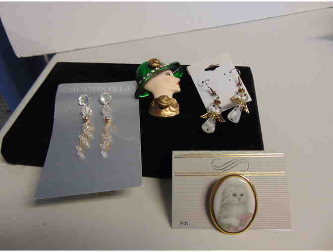 1 pair Christin Burr earrings; 1 retro pin, cat angel earrings and one cat pin.