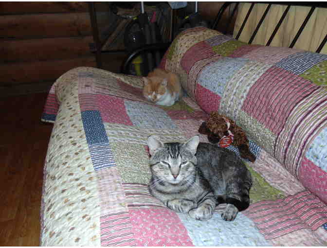 This sweet male cat was one of 4 dumped in the fall of 2018 at Rustic Hollow. He and his three friends were evidently used to being inside/outside cats as they had no trouble adapting to the winter and all the snow did not deter them from coming to our feeding station. In the spring, Wanda would sit on the deck with him as he became friendlier and one day he just let us pick him up and bring him inside. He now has no interest in going to the door to want out, though at first he seemed confused as if he 'should' be let out but really did not want to. He is the perfect gentleman now inside, and is like a puppy dog, following us around and spending lots of time on laps. Of the four that were dumped, two are friendly, one is getting better and one is very feral, so was never touched by humans and lived outside all the time. She will be released once her spay healing time is up (2-3 weeks) so she can be with the cat she buddied with outside, our ssemi-friendly stray Dewey. Dewey refuses to go into the trap, so our hope is to woo him with Wanda's 'cat whisperer' charm. In time. In the meantime, Samson says he'd love a sponsor. Your winning bid will sponsor Samson up to 3 months.