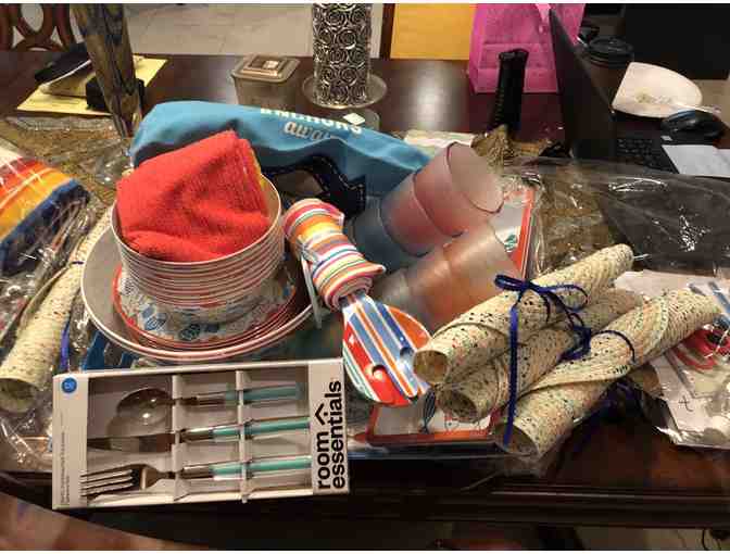 Place mats, serving dishes, cups, bags, bowls, plates, and silverware...