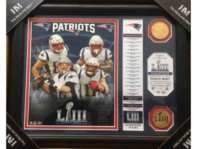 Commemorating the Super Bowl 53 Champions! This 13” x 16” frame with double matting and a glass front panel features a custom and individually numbered 8" x 10" photo of the Super Bowl 53 Champions key players as well as a banner listing the teams regular season and post season games and scores. This collectible frame is highlighted with a minted 39mm bronze Super Bowl 53 Champions commemorative coin and a 39mm bronze Super Bowl 53 commemorative coin. A numbered certificate of authenticity is matted between both bronze coins. A Limited Edition of only 5000 and officially licensed by the NFL and NFLPA. Proudly made in the U.S.A. by The Highland Mint!