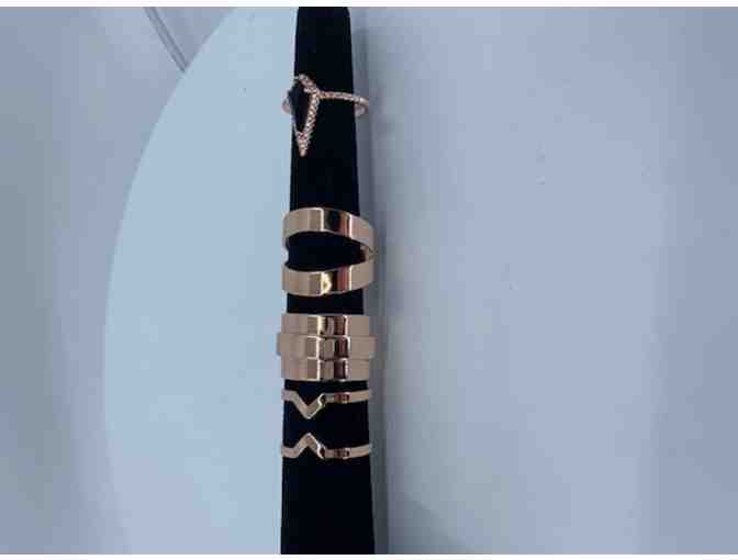 These four captivating rings may be worn together on different hands or in various combos. 14 karat rose gold Vermiel high polished rings. Black onyx, and white sapphires last prism ring.