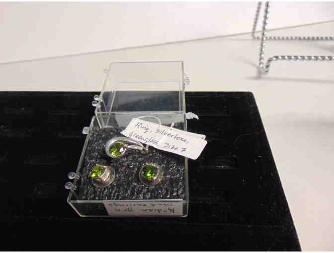 Vintage green glass silvertone ring is a size 7 and Green stud earrings are 1/4".