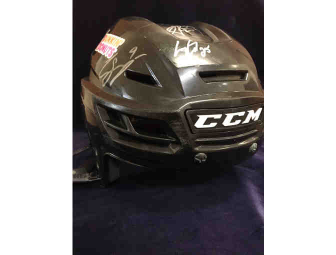 The Black CCM Helmet is signed by members of the 2017-2018 Providence Bruins Team. Among those who signed the helmet are: Zach Senyshyn, Peter Cehlarik, Trent Frederic, Jakob Forsbacka Karlsson, and Karson Kuhlman (all have played with Boston this year).