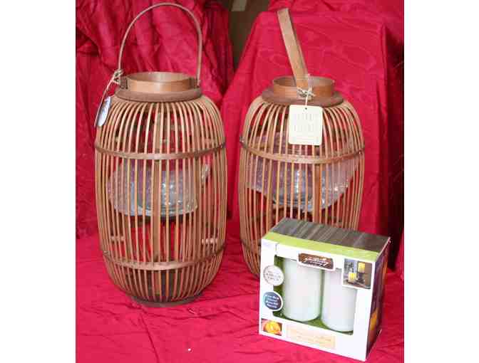 Incorporate illuminating beauty into your decor with two large woven bamboo lanterns. Hand-shaped eco-friendly bamboo surrounds a pillar candle holder in an openwork design. The laterns are approximately 18.5" tall. A set of LED candles with timer is included.