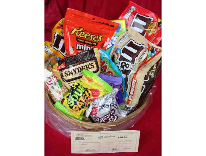 This gift basket is overflowing with a variety of candies guaranteed to satisfy that sweet tooth - 10oz bags of M&M's (plain, peanut, almond, and peanut butter), Reese's Mini, Fruit Gushers, Haribo Sour Cubes, Carmel Corn, Sour Patch Kids, Pretzels. Also included is a $20 gift certificate to Berlin Market.
