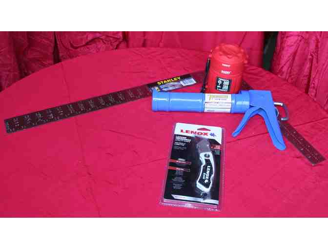 This tool collection from Berlin Lumber includes Utility Knife, Caulking Gun, Square, and Flashlight.