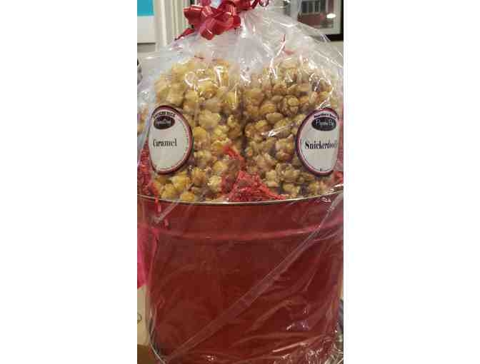 A two-gallon red tin stuffed with 5 Junior sized bags of candied popcorn from Northern Neck Popcorn - a handcrafted, gourmet popcorn shop in Gloucester, Virginia. Enjoy your personal popcorn experience the following candied flavors featured in this bucket: Caramel, Snickerdoodle, Cinnamon Red Hot, Cheesecake, and Cotton Candy. This popcorn is very popular among Camp PARC staff from the Gloucester area. Taste what the excitement is all about!
