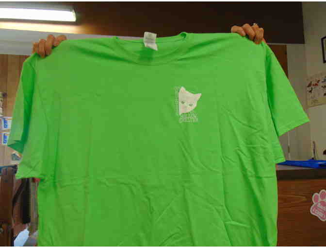 Bright Green Size 2X New Logo Rustic Hollow T-shirt. Click on photo to see front and back view of logo. The logo was drawn by Brianne DeVries, who is one of Rustic Hollow's caregivers.