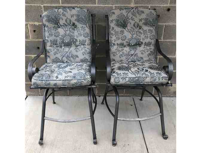 Four used tall, swivel patio chairs with cushions. One chair is missing the cushion.
