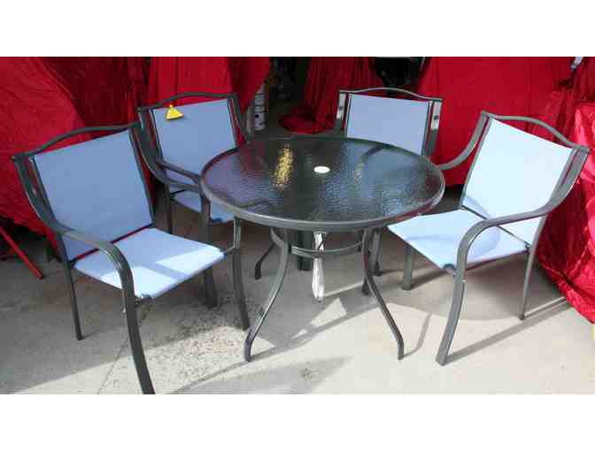 Gray metal round glass outdoor dining table with four coordinating stackable sling chairs in a denim blue color.