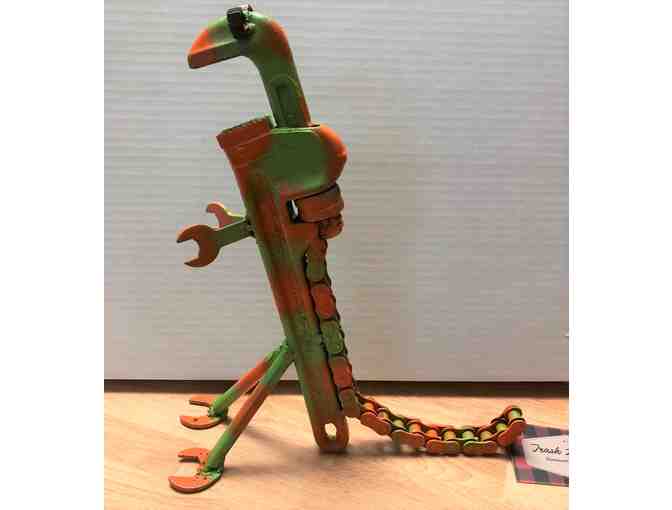 A creation made by Joe from treasures he finds in the trash. This trash-o-saurus stand 11" tall and is welded together from a pipe wrench, a bike chain, wrenches, and nuts. To see more of Joe's creations stop at the Coal Miners Cafe in Jennerstown and tell him you saw his work at the Camp PARC Auction.