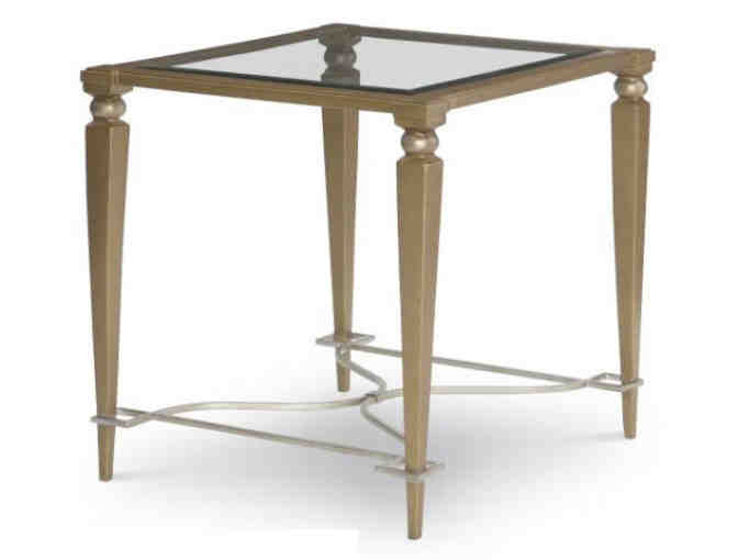 Square end table with inset glass and tapered interconnected legs, antique brass