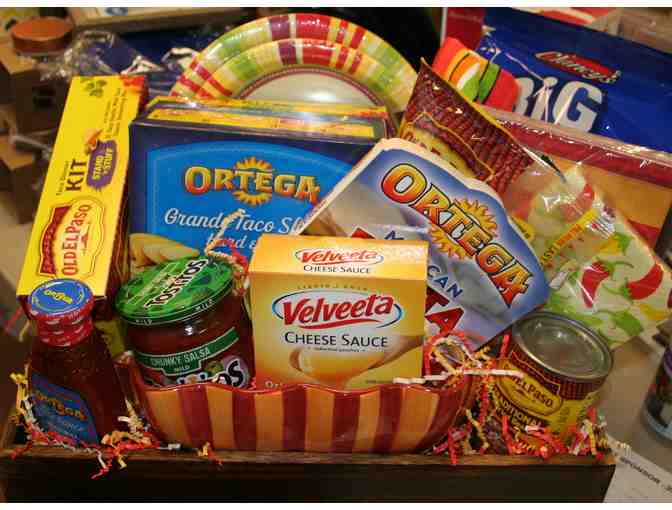The Family Taco Night Supplies on a wooden serving tray includes a variety of Taco Dinner Kits - Old El Paso Stand'n Stuff, Ortego Grande Hard & Soft Taco Shell Kit, Ortego Soft Taco Kit - Tostitos Chunky Salsa, Old El Paso Refried Beans, Ortego Original Taco Sauce, Velveeta Cheese Sauce Packages, Old El Paso Floured Tortillas Shells, Bag of Big Dipper Tortilla Chips, Coordinating Glass Serving Dish, Ortego "Mexican Feast" Recipe Book, Coordinating Plates and Napkins and Dish Towel.