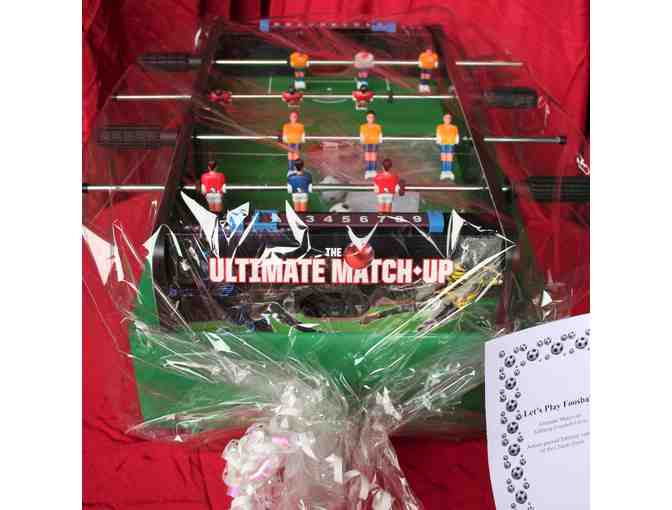An Ultimate Match-up Tabletop Foosball Game. Action packed tabletop version of the classic game. This tabletop foosball is rather heavy weighing in at over 5 pounds and measures about 21" long. Easy grip handles. Brand new.