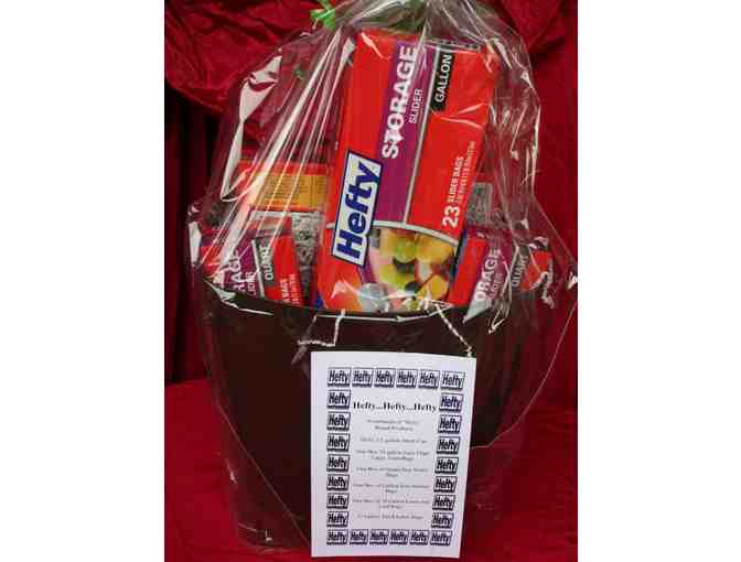 A Hefty 3.5 Gallon Trash can filled with a box of 30 gallon Easy Flaps Large Trash Bags, a Box of Quart-Size Slider Bags, a Box of Gallon Size Storage Bags, a Box of 39 Gallon Lawn and Leaf Bags, and a Box of 13 Gallon Tall Kitchen Bags.
