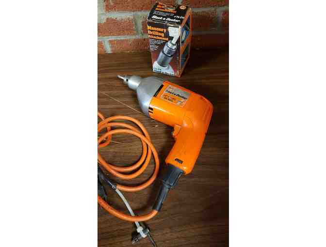 A used black & decker 3/8" Variable Speed Reversible Drill - 7190. Also included is a Masonry Drilling Attachment - 70-215