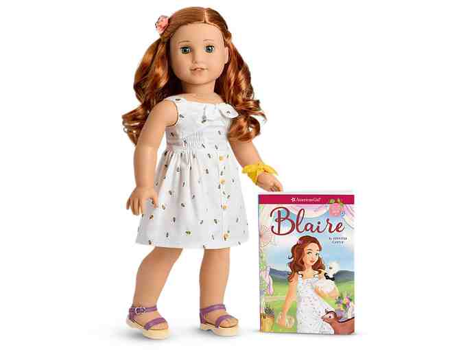 The 18" Blaire doll has bright green eyes that open and close, and curly red hair. She has a huggable cloth body, and her movable head and limbs are made of smooth vinyl. She arrives in her favorite dress with a bumblebee print and gathered tie, a sunny yellow bandanna bracelet, a hair comb with pink flowers that remind her of a bouquet and purple platform sandals. Also included is the Blaire paperback book.