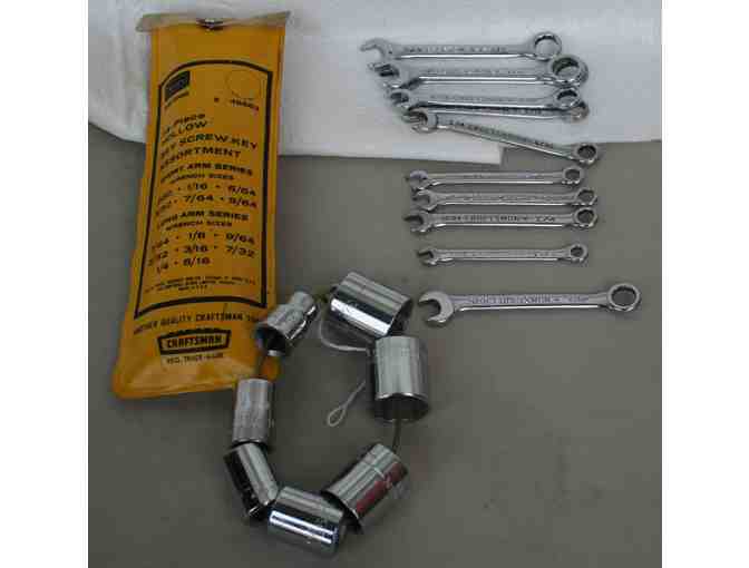 Used Craftsman tools, 14 piece set of hollow set screw key, 12 Craftsman wrenches, 7 Craftsman Sockets, and Craftsman Grip Driver.