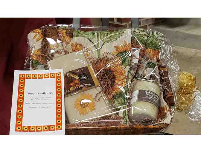 Set of Eight Cloth Sunflower Decorative Placemats, Set of Coordinating Dinner Napkins, and Flameless LED Pillar Candle.