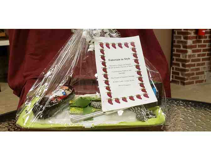 Decorative Grape and Marble Board for Both Cheeses or Meats, Coordinating Napkins and Spreader, One Pound of Summer Sausage, RADA Cook's Utility Knife, and Box of Crackers.