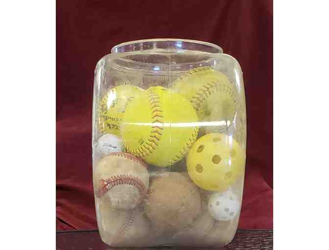 A fishbowl filled with a collection of assorted balls - softballs, wiffle balls, baseballs, golf balls and more!