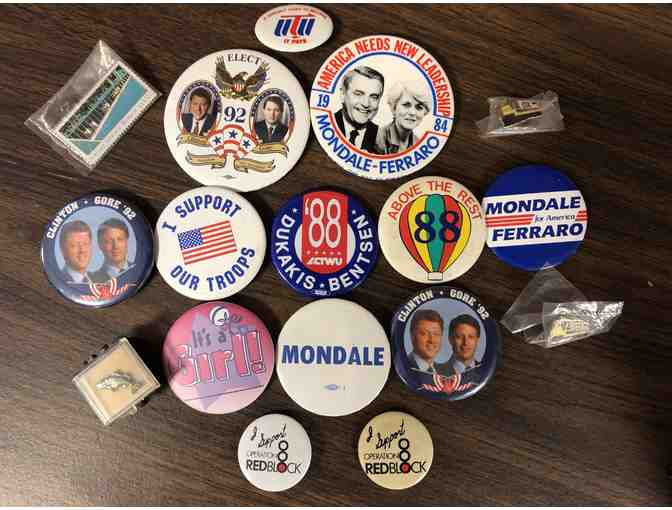This lot is perfect for pin collectors! Contains a variety of vintage pins from various election campaigns, the Vietnam Veterans Memorial, CSX trains, and more!
