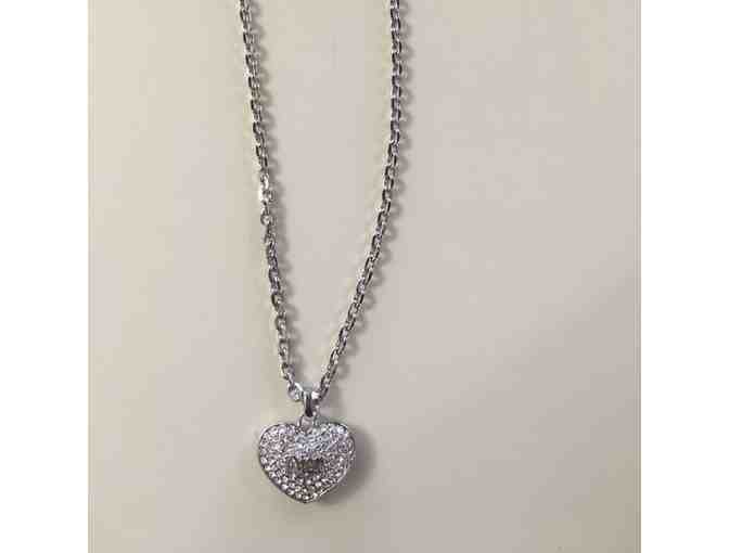 Dior heart jewelry set includes matching necklace and bracelet each featuring a rhinestone heart pendant with the word Dior across the center and 1 set of coordinating rhinestone Dior earrings.