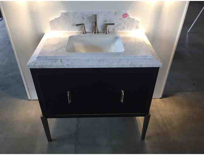 36x36 Custom Vanity which includes - Vancouver Quartzite Countertop - Kohler - White Caxton Rectangle Under Mounted Bathroom Sink With Overflow - Brizo Gold Brushed Levoir Drawer Pull - Brizo High Spout Wide Spread Brushed Gold Levoir Washroom Faucet with Black Crystal Handle Accent