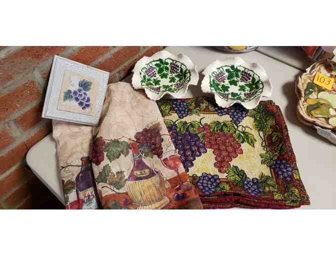 Decorate your kitchen in these vine and wine themed accessories for your kitchen. Set includes 4 woven placemats, 2 window valances, trivet, and 2 bowls.