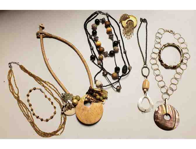Gold jewelry collection with brown and olive tones accented with natural elements. This collection has 1 necklace and bracelet set, 4 necklaces, 2 bracelets, and 1 brooche.