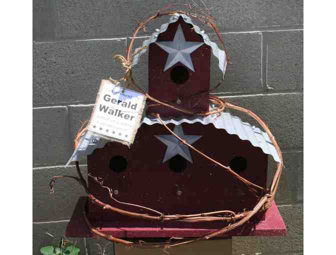 A handmade birdhouse with enough space for up to 4 residents, the house can be mounted on a 4" x 4" pole, (not included). The house is accented with stars and grapevines and was handcrafted by Somerset County Commissioner Gerald Walker.