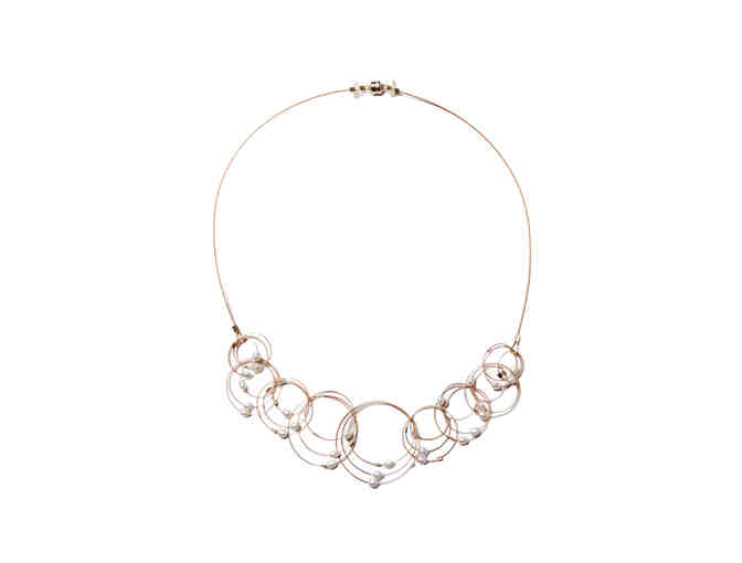 Nylon coated stainless steel cable with 14k gold filled crimps and fresh water pearls.