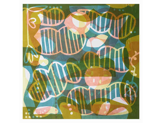 Monotype on BFK paper with oil base ink, using various tools, such as chopsticks, stencils, and q-tips, to create freehand surface design and motifs. Multiple layers with registration to complete the work. The print is matted in 18" x 18" acid free mat board.