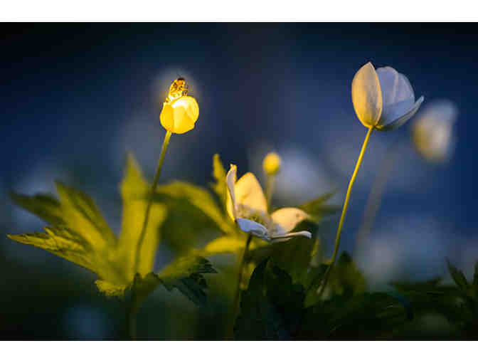 I was very excited to capture the moment when a firefly illuminated wood anemone wildflowers in my garden in Iowa. Framed.