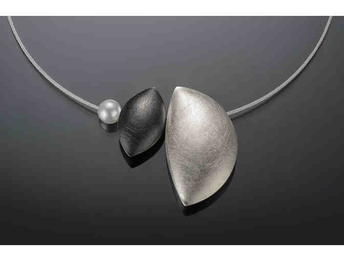 Necklace, oxidized silver, silver, and pearl on a 16" stainless steel cable wire.