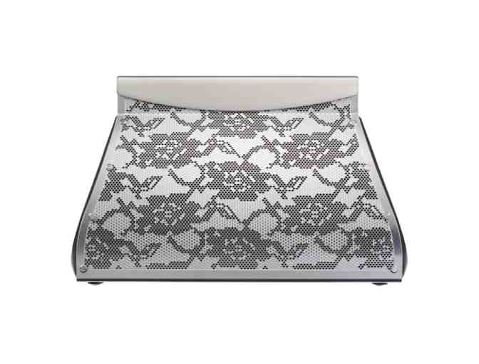 The lace clutch is hand fabricated in etched stainless steel with leather gussets and a magnetic closure. This special piece accommodates the phone, credit cards, cosmetics and is a perfect clutch for a wedding and for special occasions.